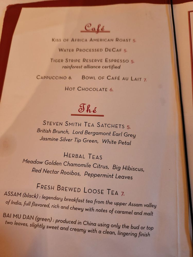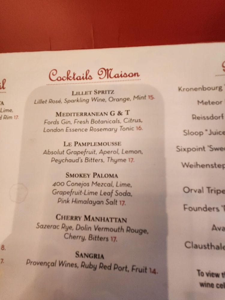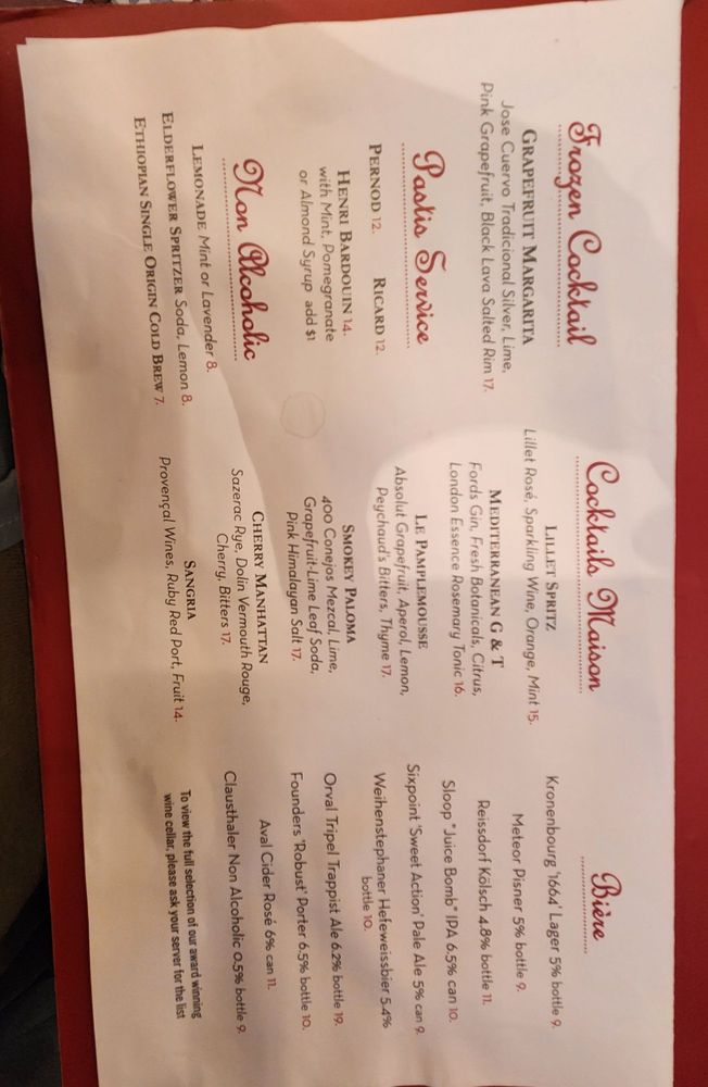 The menu features a variety of French-inspired dishes, with highlights such as Warm Goat Cheese Croustillant, Soupe a L'oignon Grantinee, Branzino, and Jarret d'Agneau. The food is well-prepared and presented in generous portions, making it ideal for a pre-theatre dinner or a special occasion.